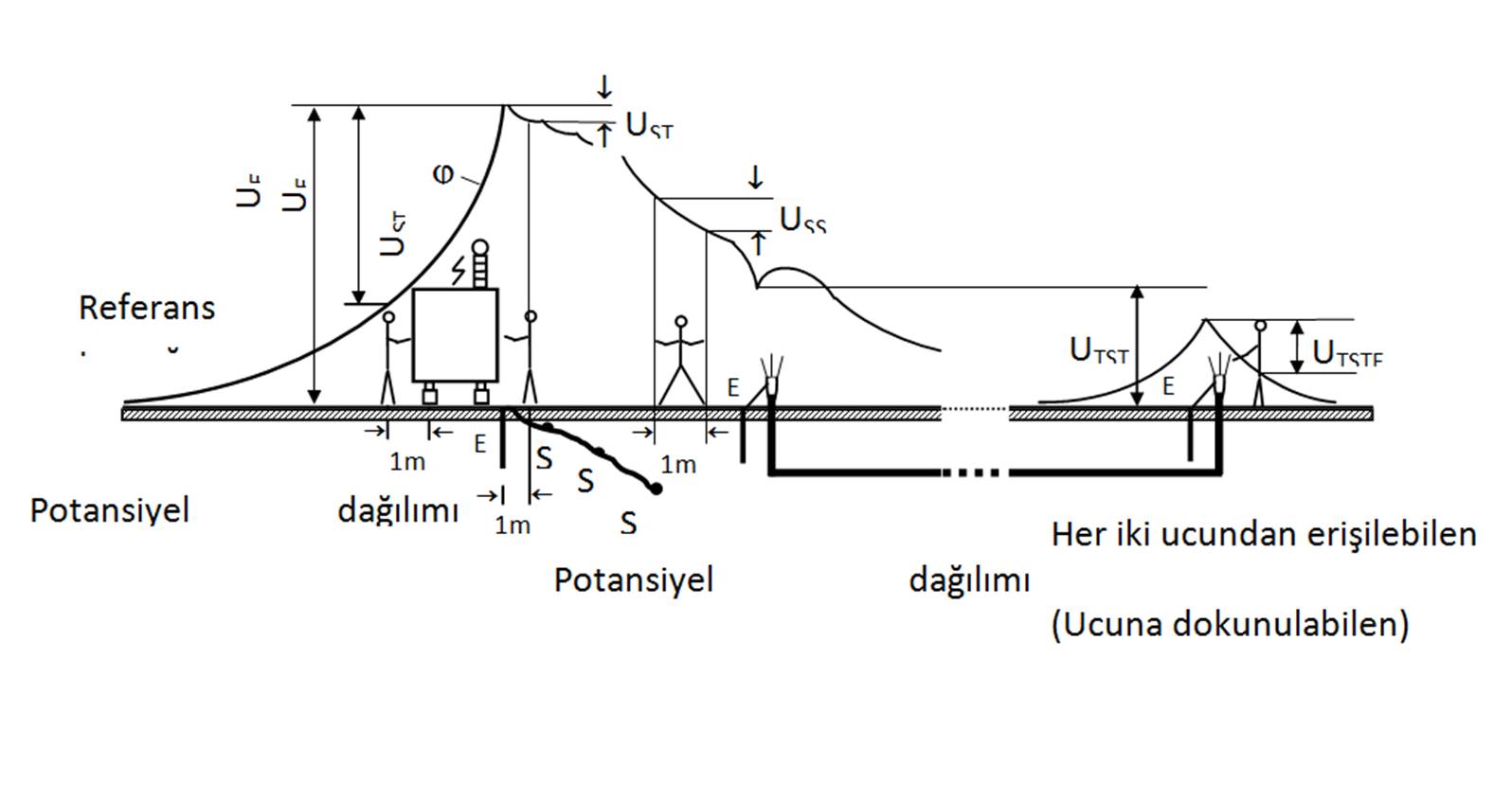 21) Adım gerilimi (US): Topraklama geriliminin, insanın 1 m’ lik adım açıklığı ile köprüleyebildiği bölümüdür. Bu durumda insan vücudu üzerindeki akım yolu ayaktan ayağadır (Şekil-2'ye bakınız).