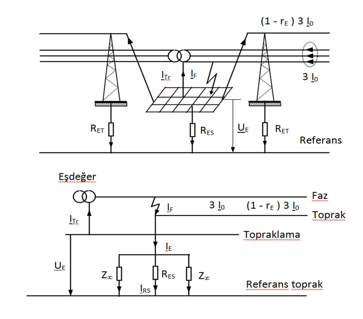 17) Topraklama gerilimi (toprak potansiyel yükselmesi) (UE): Bir topraklama tesisi ile referans toprağı arasında oluşan gerilimdir (Şekil-2'ye bakınız).
